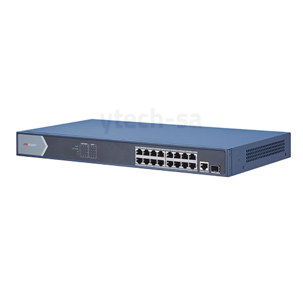 - 16X Gigabit PoE ports, 1 × Gigabit RJ45 port, and 1 × Gigabit SFP fiber optical port.